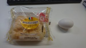 ゆで卵アーンドみんな大好きヤマザキ「ホワイトデニッシュショコラ」です! このパン冷やして食うと最高です。ただいまキャンペーン中らしく1点ゲットしました。ありがとうございます。
