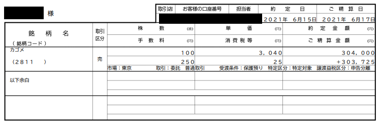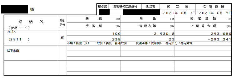 2,930円現物で100株ゲットです。30万円弱という大金がトマトに投資された瞬間です(カゴメさんごめんなさい。いろいろやっていますよね…)。なんか黒塗りされている書類を見るとドキドキしますね。自民党が出した公開文書のようです。やましいことは一切ありませんのでご安心ください。